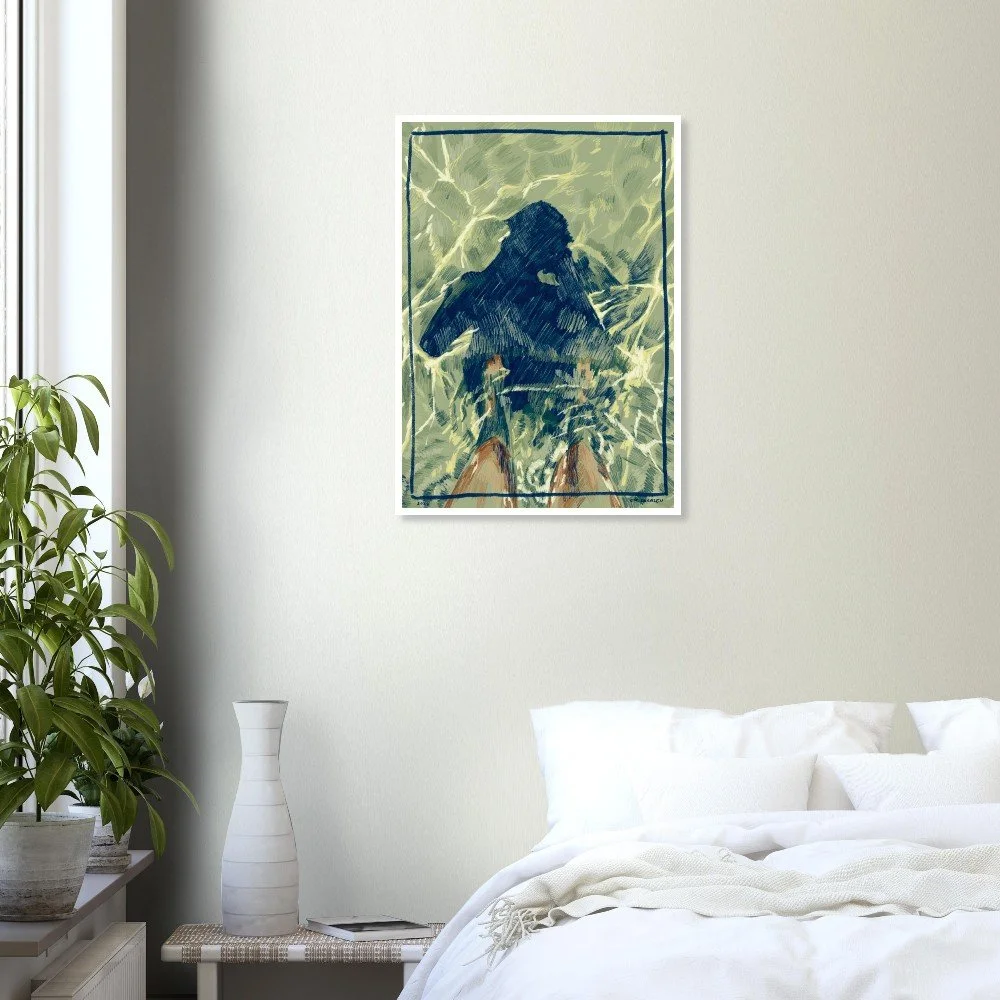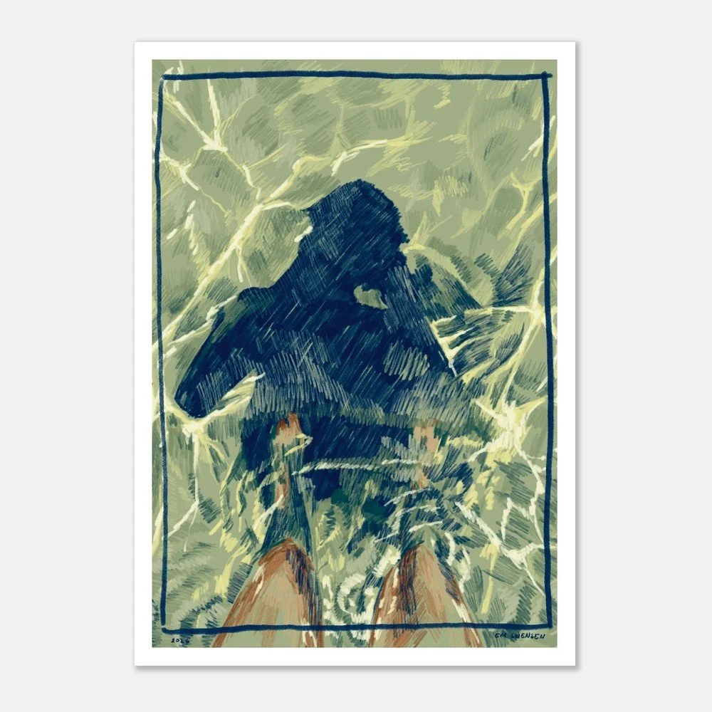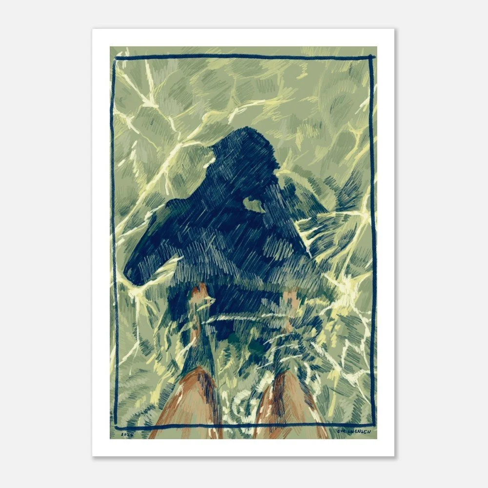"Badejente" er en digitalt tegnet illustrasjon av meg (Eva Swensen), og er tilgjengelig som plakat. Pynt opp hjemmet ditt med en tegning av strand, syden og ferie. Plakaten er hovedsakelig blå, grønn og gul.
